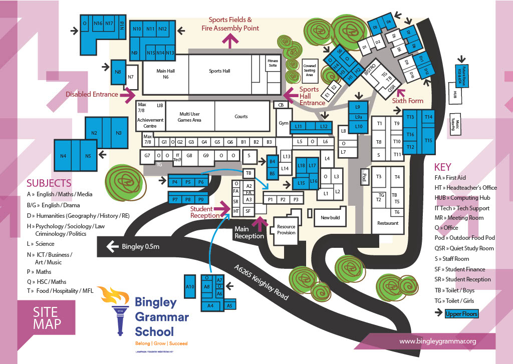 Bingley Grammar School is a massive site and takes a little bit of getting used to. Please use this map to help you find your way around - it won't take long before you have settled in and know exactly where you are going and the best route to get there!
